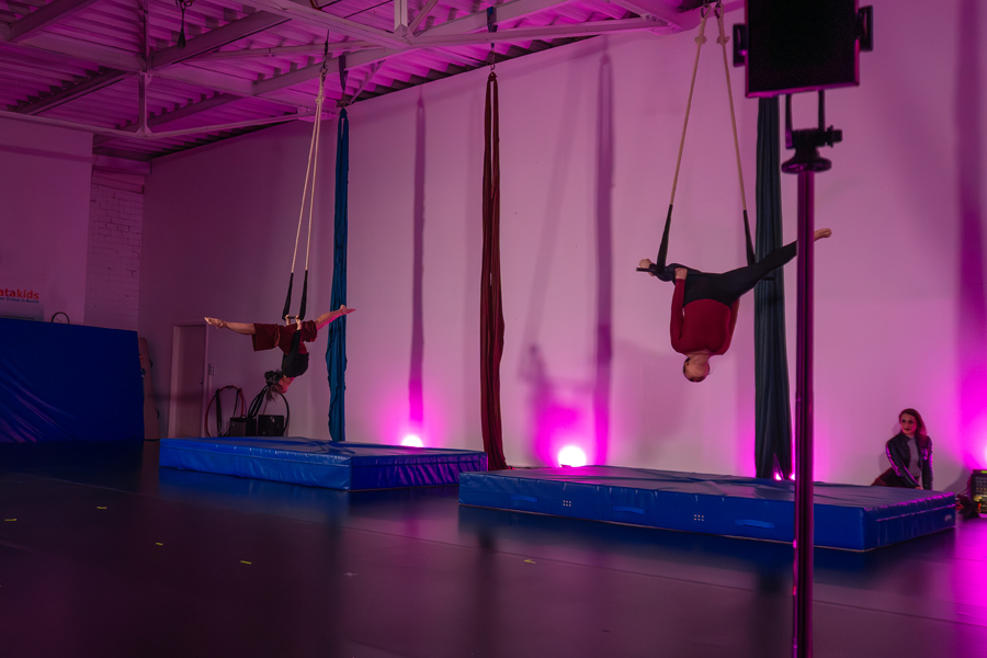 We offer special Intro classes for Aerial Hoop and Aerial Silks for beginners with no previous experience, in which you will first build up strength, learn the basics, and get a feel for the equipment. Once you are ready, you can move on to the Beginner classes. No Intro class is required for Trapeze and Aerial Hammock, so you can participate in the classes even without any previous experience.